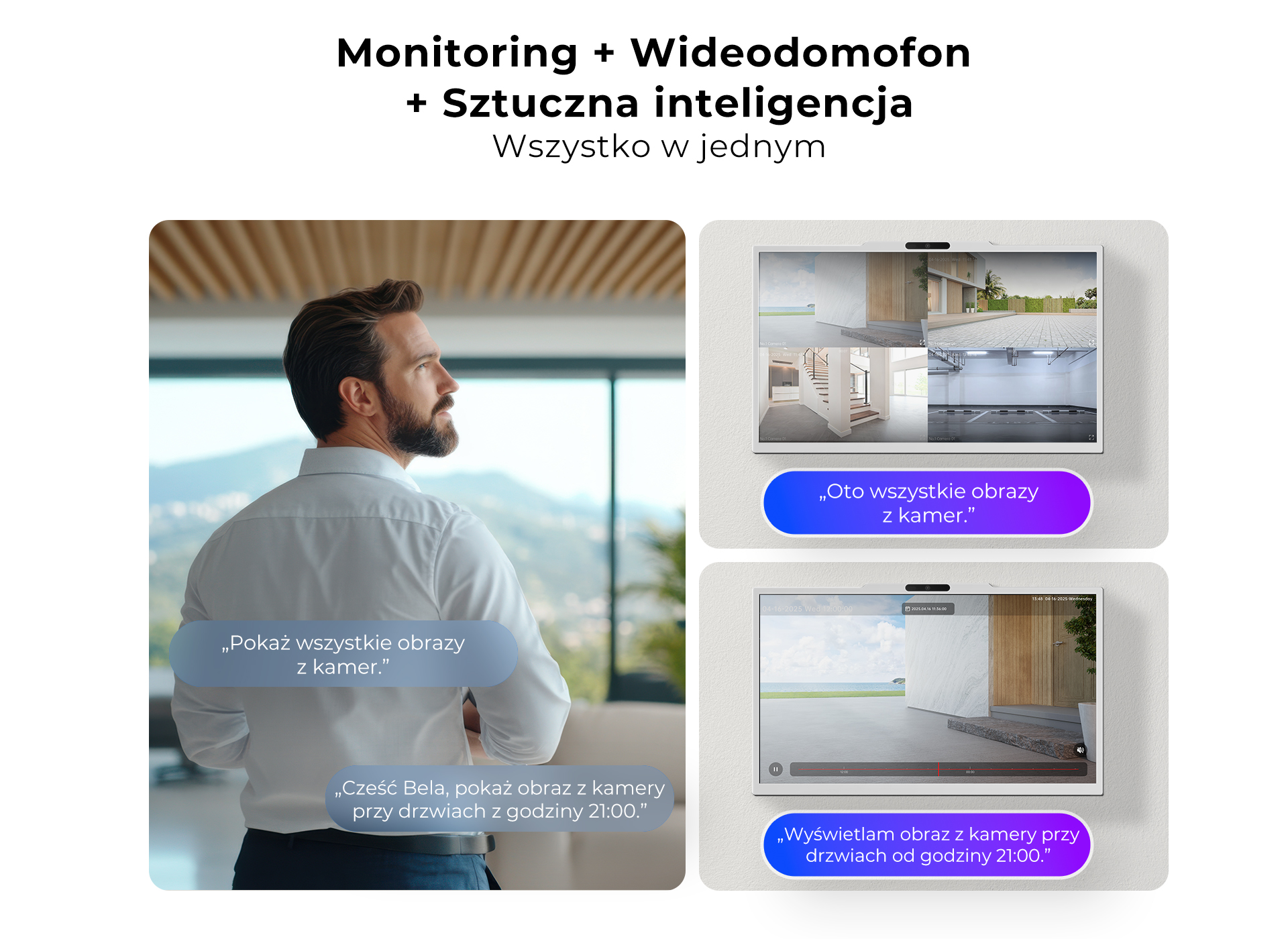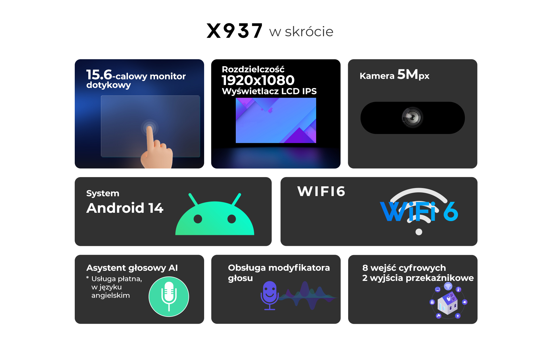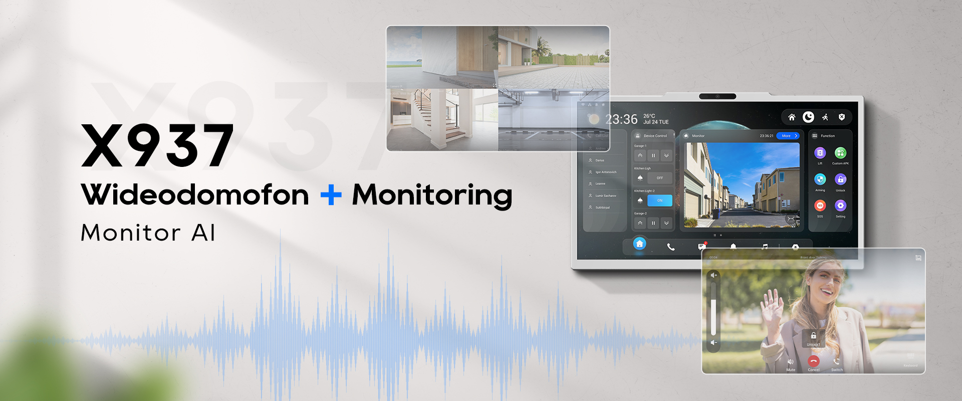 Model X937 łączy funkcję zaawansowanego monitoringu z możliwościami inteligentnego interkomu. Duży ekran o przekątnej 15,6 cala umożliwia wygodny podgląd nawet 25 kamer jednocześnie, gdy system jest połączony z rejestratorem NVR przez złącze HDMI. Urządzenie pozwala również prowadzić rozmowy wideo oraz sterować dostępem do drzwi. Dodatkowo obsługa głosowa oparta na technologii AI ułatwia korzystanie z najważniejszych funkcji systemu.
