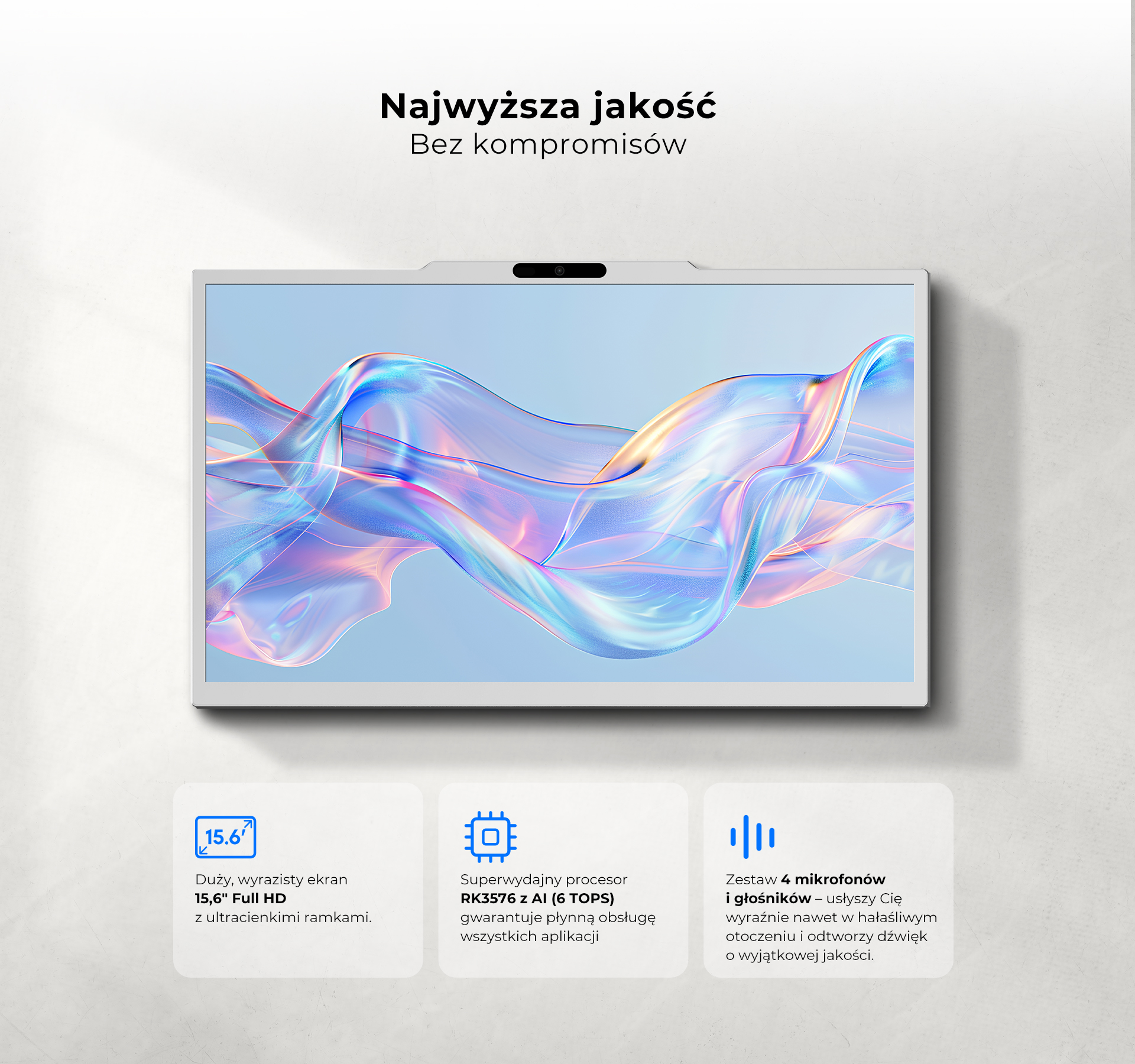 Monitor wideodomofonu Akuvox X937 z dużym ekranem 15,6 cala, który może pełnić funkcję centralnego panelu sterowania w inteligentnym domu. Urządzenie łączy funkcje wideodomofonu, monitora podglądu kamer oraz multimedialnego panelu z systemem Android.