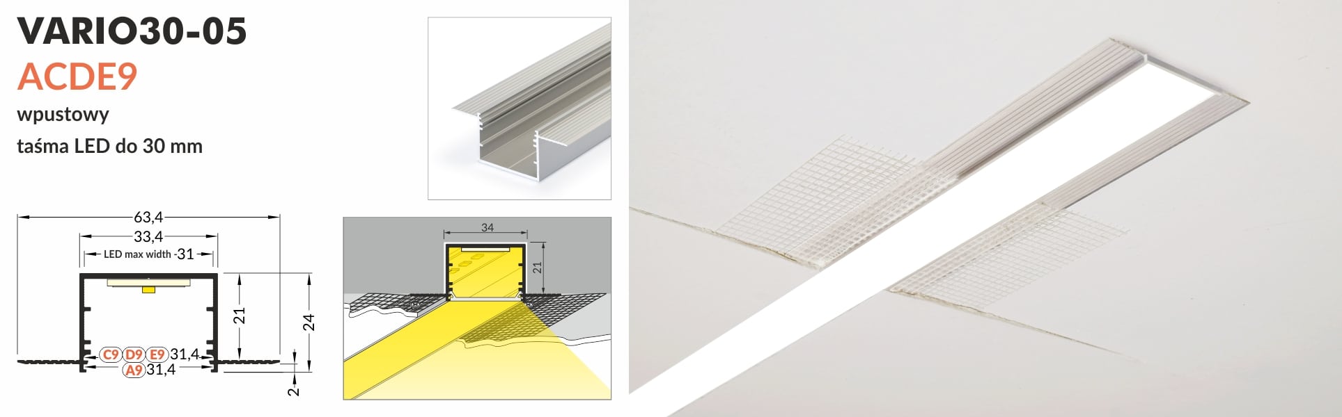 VARIO30-05 to wysokiej jakości profil aluminiowy LED wpuszczany, przeznaczony do montażu w płycie kartonowo-gipsowej lub bezpośrednio w ścianie. Doskonale sprawdzi się również w sufitach podwieszanych, umożliwiając stworzenie nowoczesnych i eleganckich instalacji świetlnych.